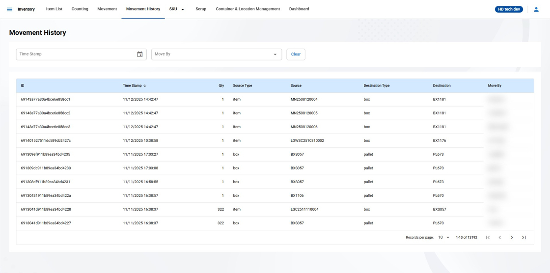 • Searchable Fields: Users can search the movement records using filters such as 'Timestamp' and 'Move By' to quickly find specific transactions.