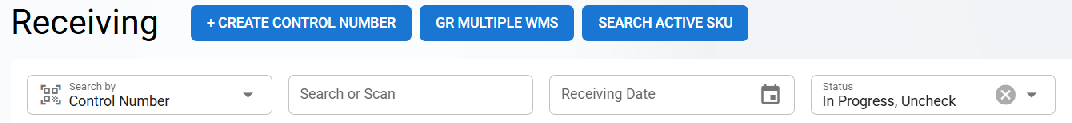 The Receiving List page is laid out to provide a clear and concise view of all entries related to the goods received, ensuring efficient tracking and processing. Below is a detailed description of each section and element found on the Control Number List page: