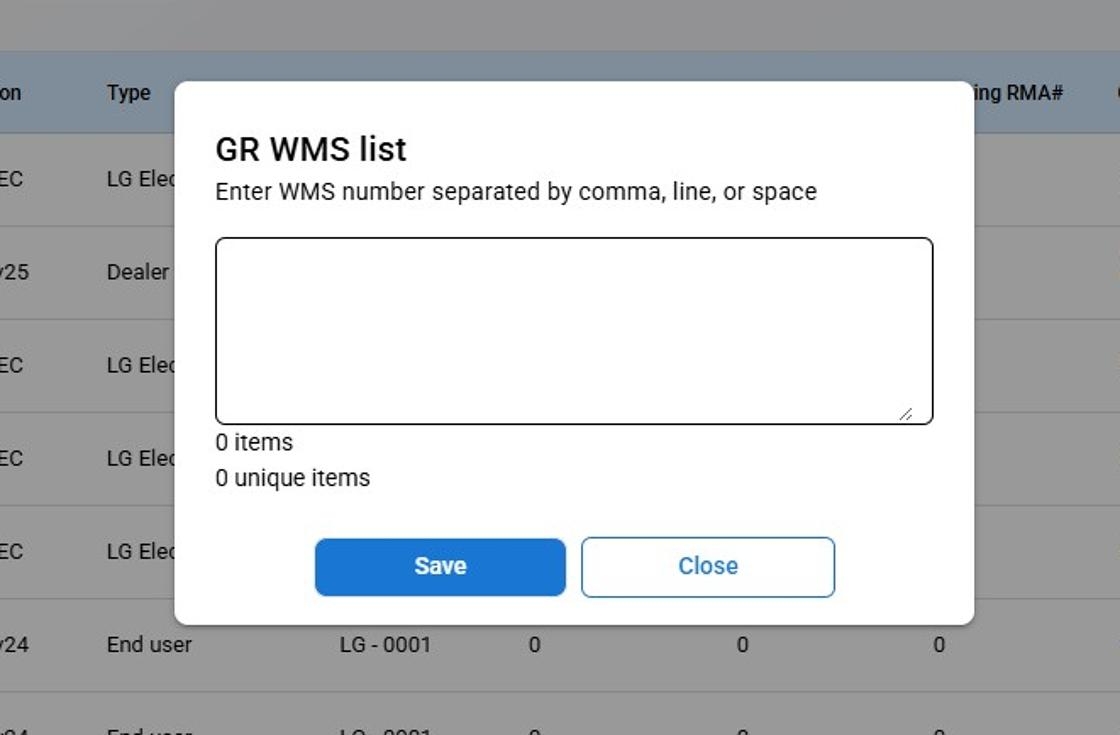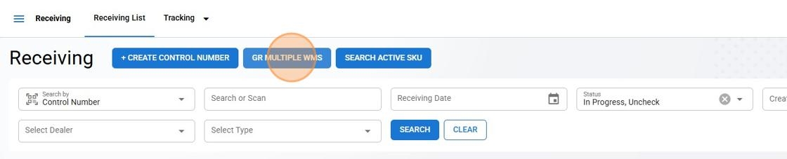 The GR Multiple WMS button is a specialized tool designed to streamline the goods receipt (GR) process for multiple items associated with various control numbers in the Warehouse Management System (WMS). This function allows users to efficiently handle batch receipts by processing several control numbers simultaneously, reducing manual entry and improving workflow efficiency. In the pop-up window, add a list of WMS numbers. You can enter them separated by commas, or paste a pre-formatted list if supported by the system.