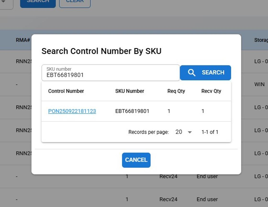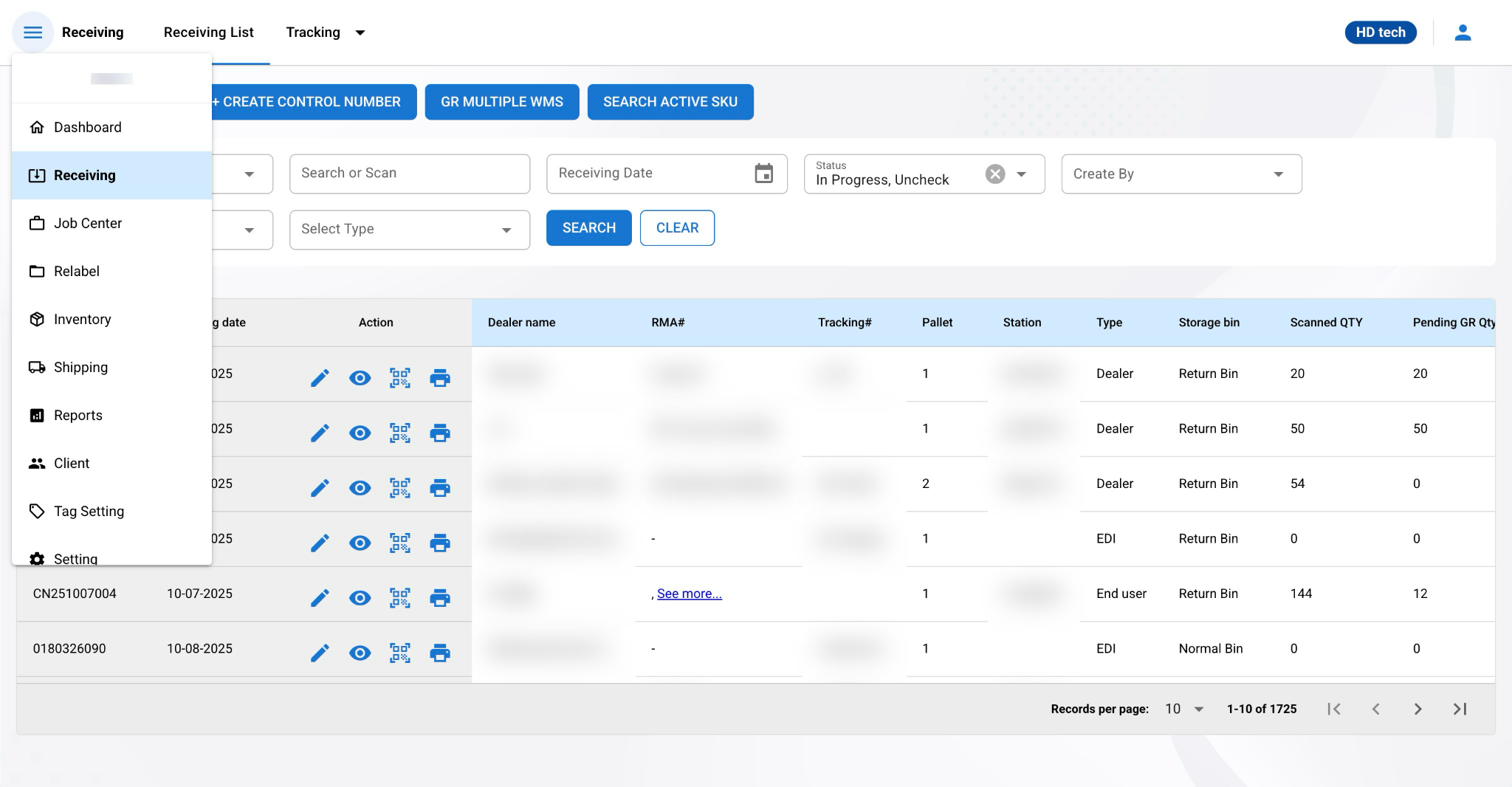 By integrating real-time data capture and providing a clear and organized interface, the Control Number List Page helps maintain a high level of accuracy in inventory management. It facilitates quick access to important information such as the receiving date, dealer names, RMA numbers, tracking details, and the status of each item received.
