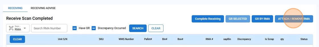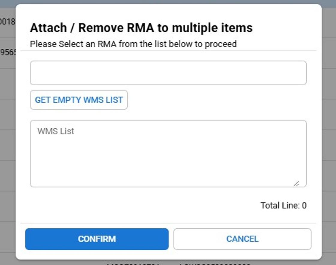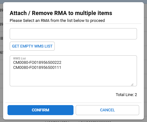 Click CONFIRM to attach the selected RMA to all items listed in the WMS field.