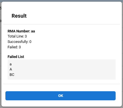 Once you confirm attaching the RMA to multiple items, the system processes the request and displays a result dialog. This dialog shows the outcome of the RMA attachment, including the number of successful and failed attachments.