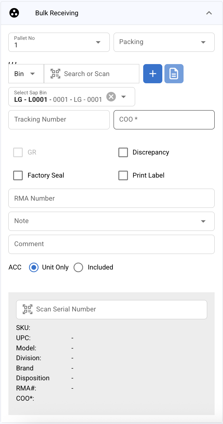 COO (Country of Origin): This field is optional if the COO can be derived from the serial number during scanning. If not, manually enter the COO.