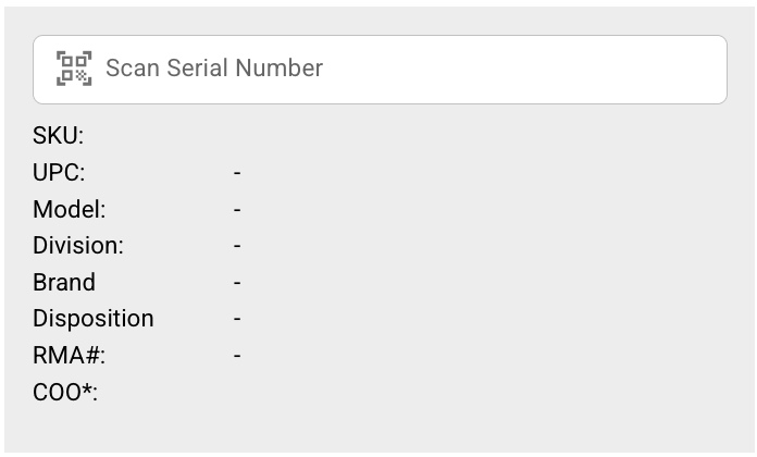 This gray section is where you scan or manually enter the item's serial number and associated details. It captures essential metadata for the item, including origin, condition, and any notes. Scanning is recommended for efficiency and accuracy, but manual entry is available for overrides.