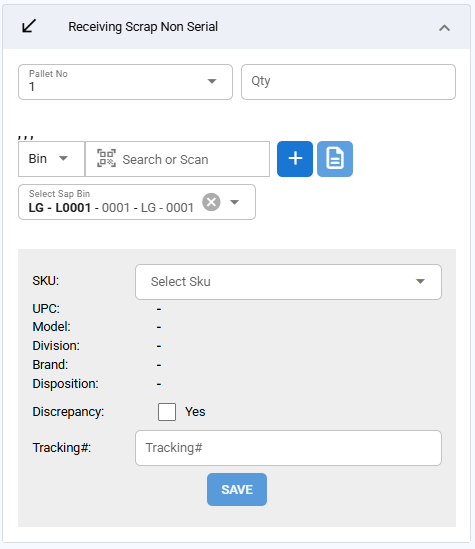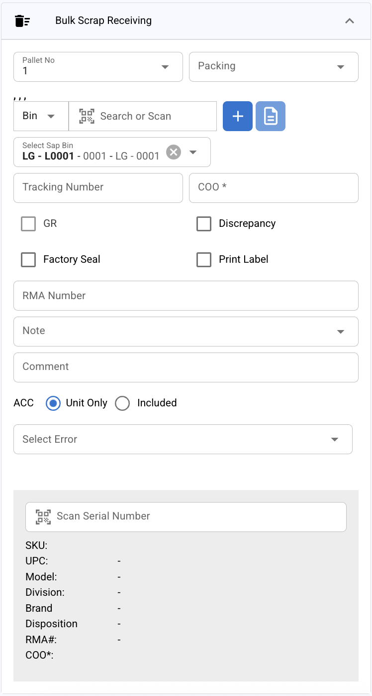 The Bulk Scrap Receiving page is tailored for processing items that are to be categorized as scrap due to damage or other issues.