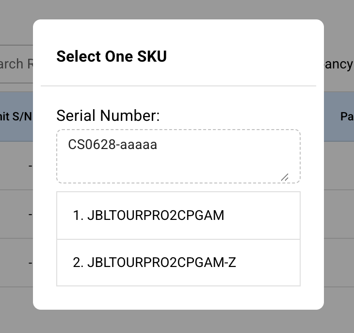 When scanning an item, the system checks the serial number. If it detects that the serial number prefix is associated with multiple SKUs, it will prompt the user to select the appropriate SKU for the item.