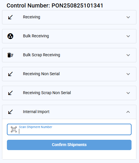 The scan page allows users to document the details of items as they are physically received in the warehouse, including items that are received as part of a bulk process or those designated for scrap. To access the scan page, users must initiate the process from the control number list.