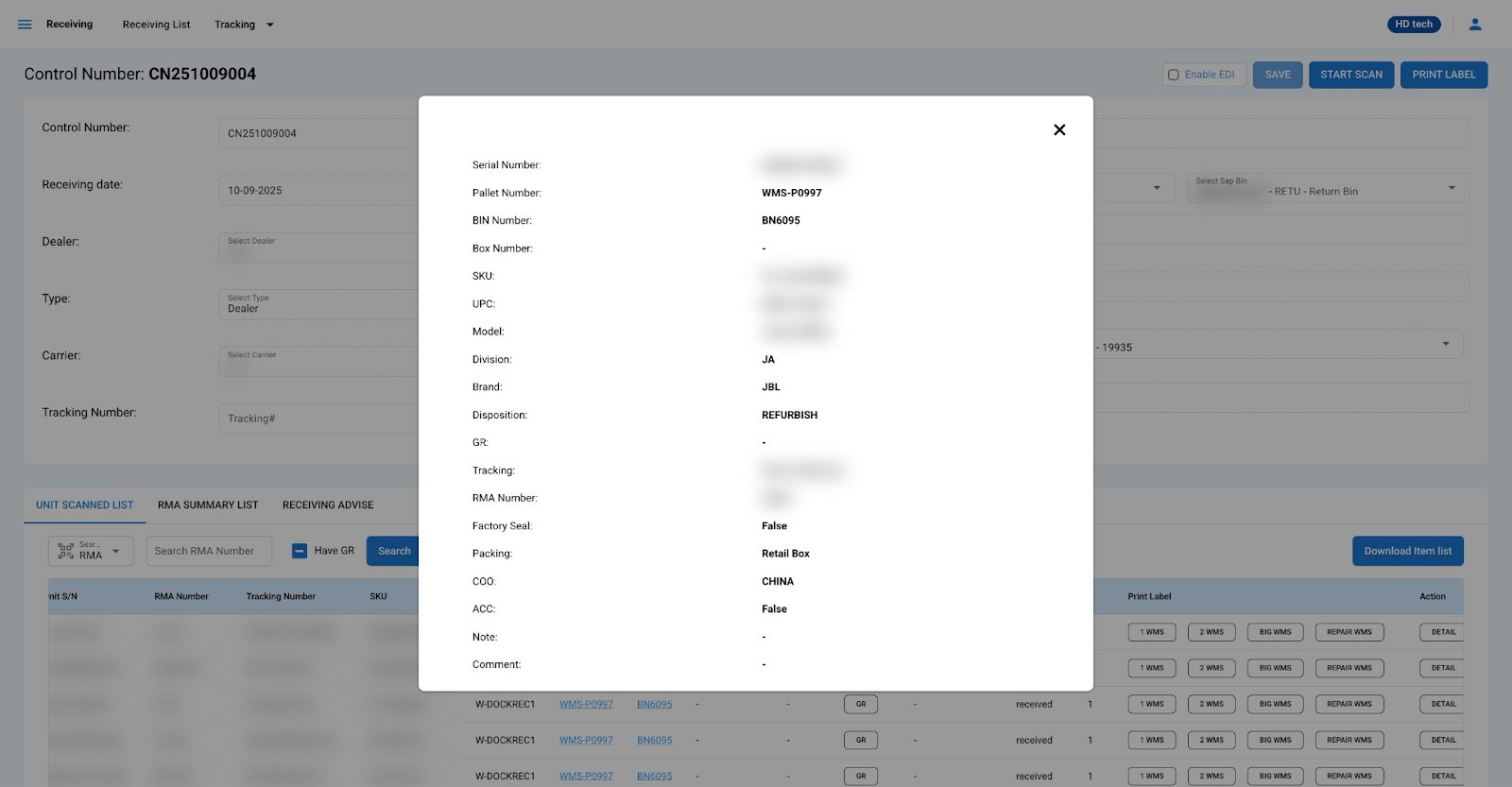 - Within the control number details, you'll find the Unit Scanned List tab displaying all the scanned items associated with the control number.