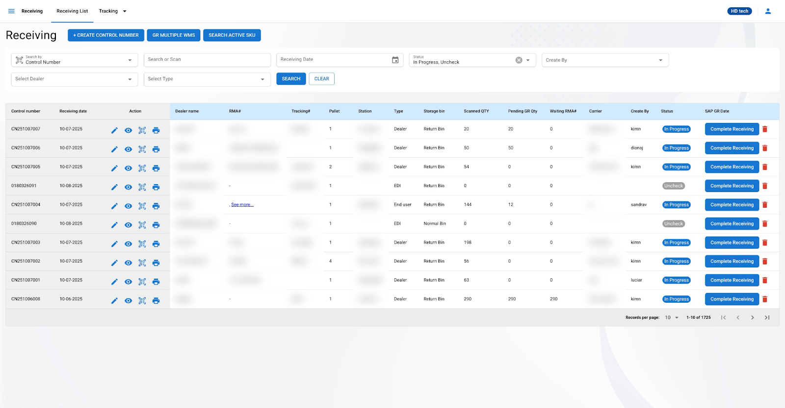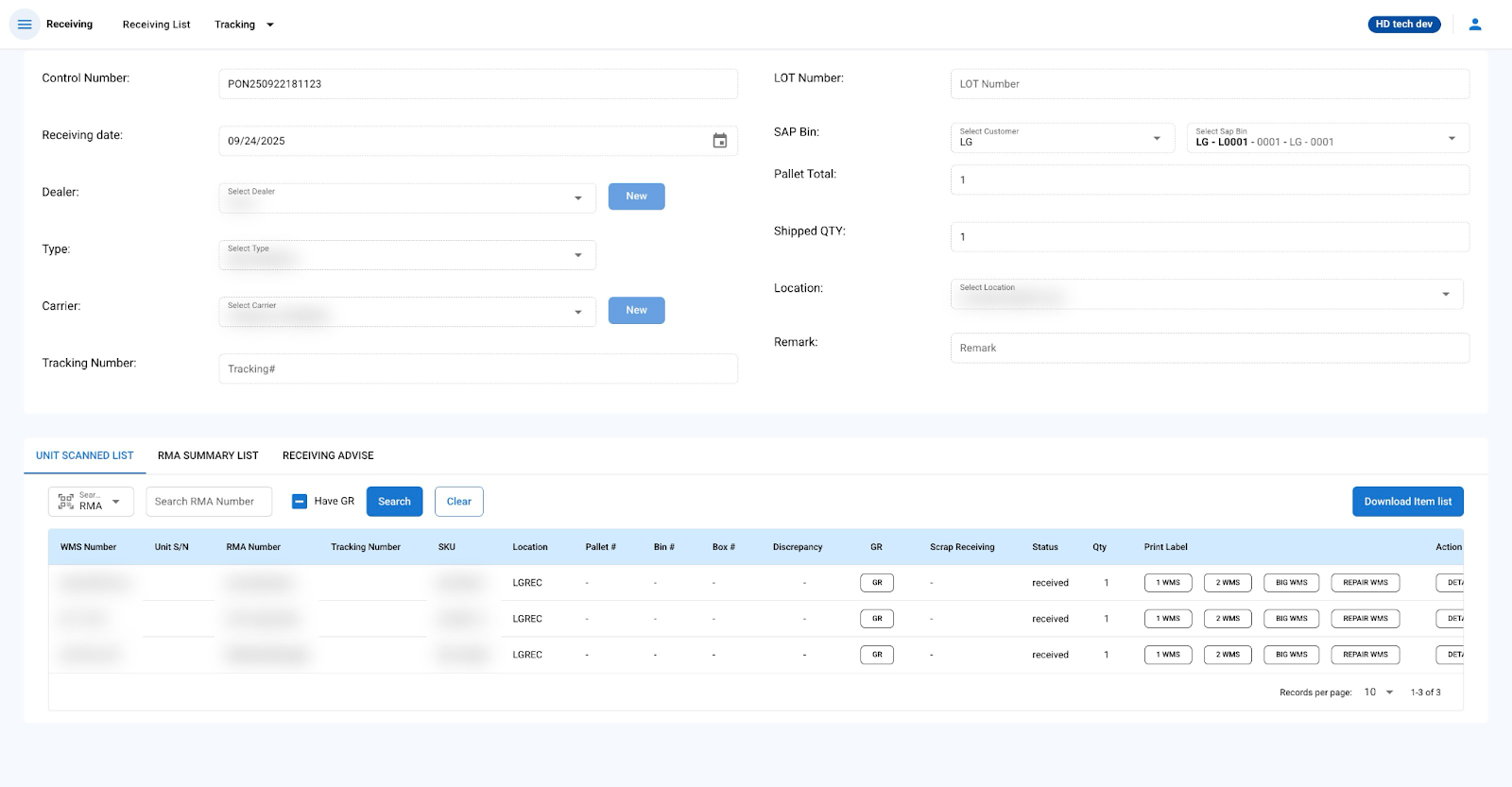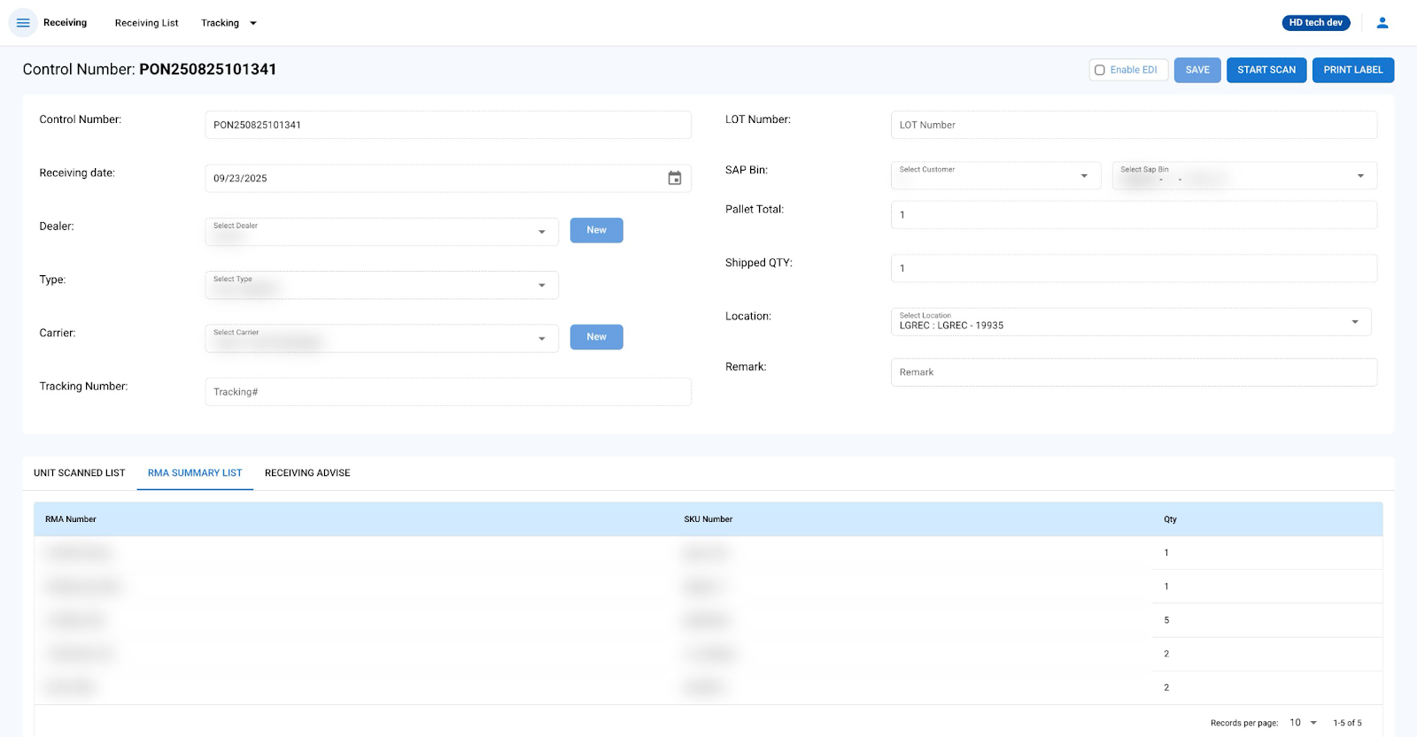 - The RMA Summary List tab provides an overview of all RMA numbers, quantities, and their statuses related to the control number.