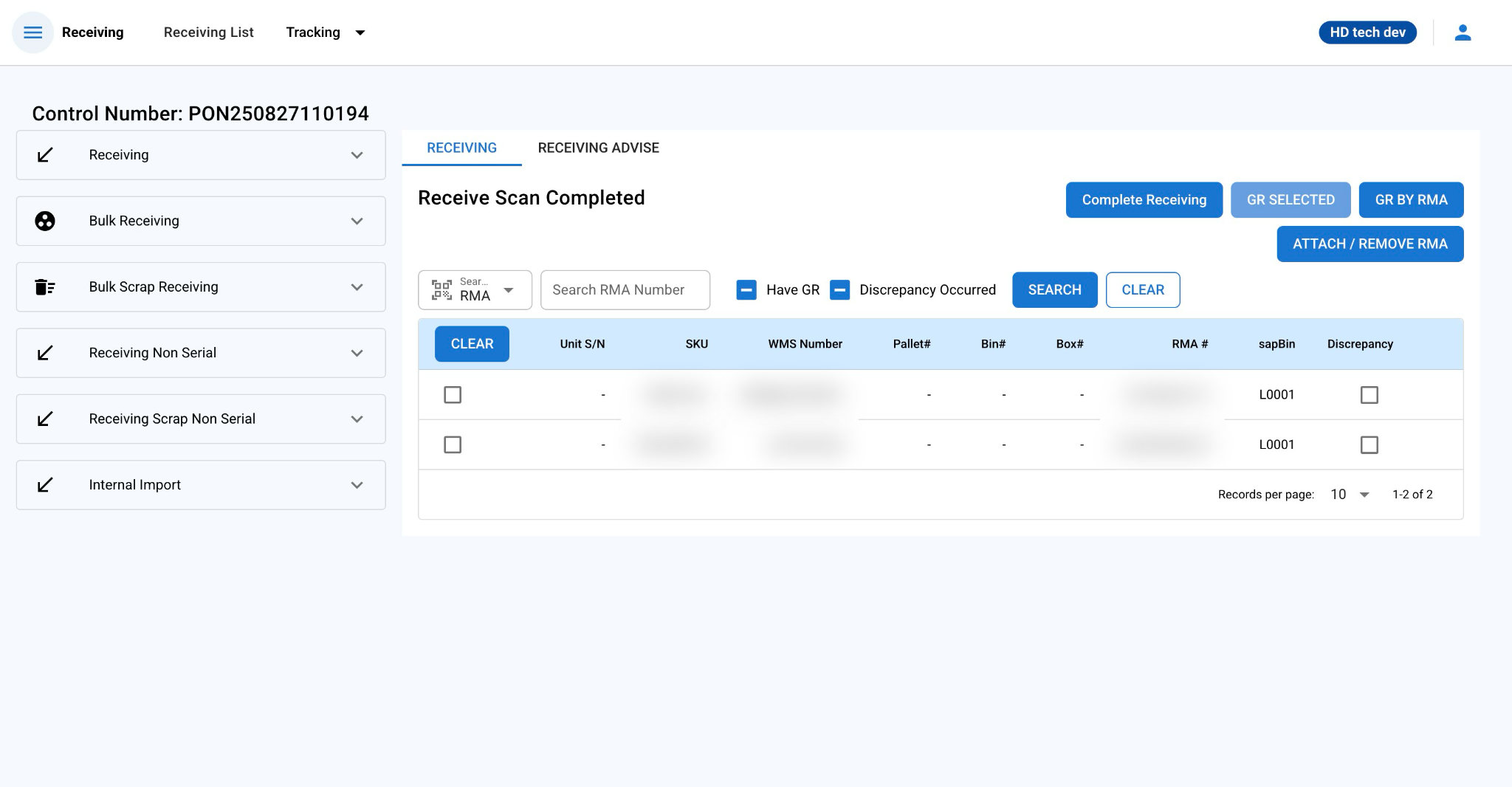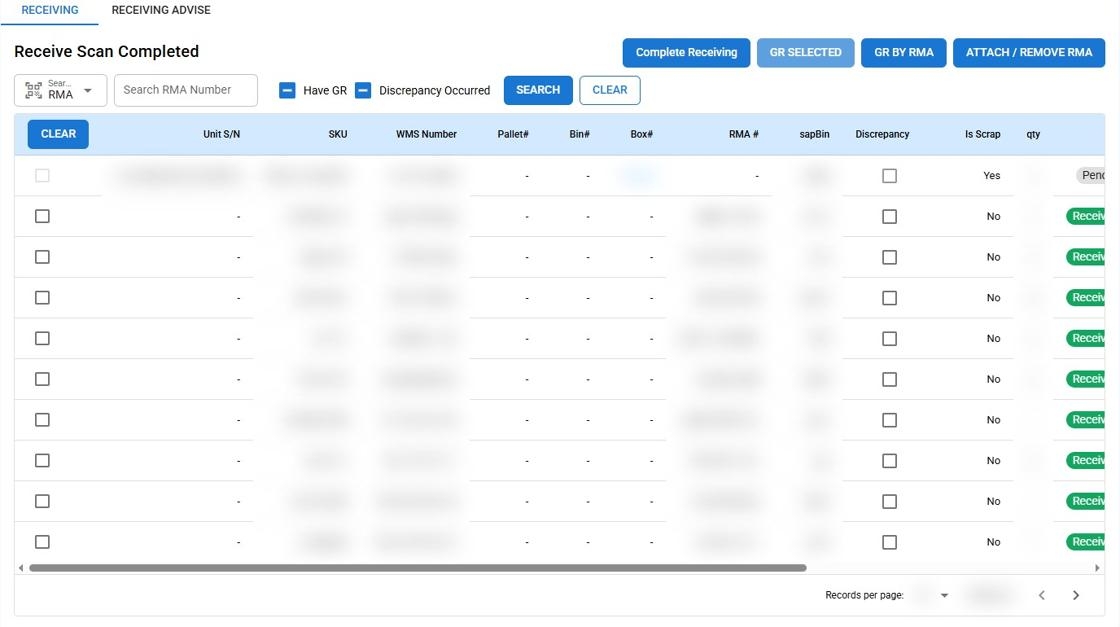 - The GR checkbox indicates that the item is ready to be included in the Goods Receipt. Users cannot select this option if an item lacks an RMA number.