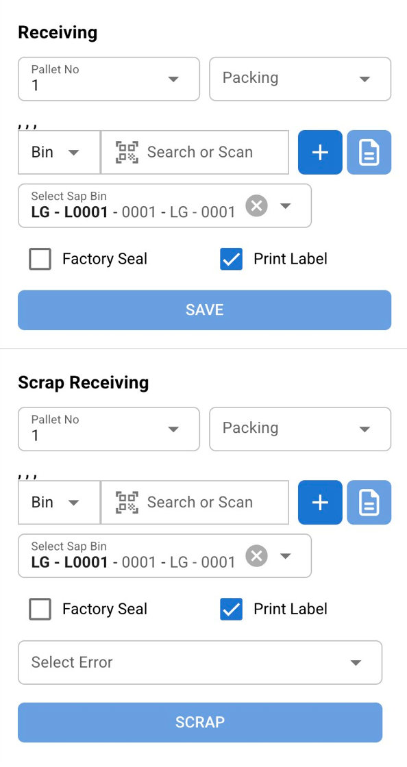 Scrap Receiving: Pallet and Location Scrap – For assigning a location to items marked as scrap. Item status will save to "Pending Scrap"