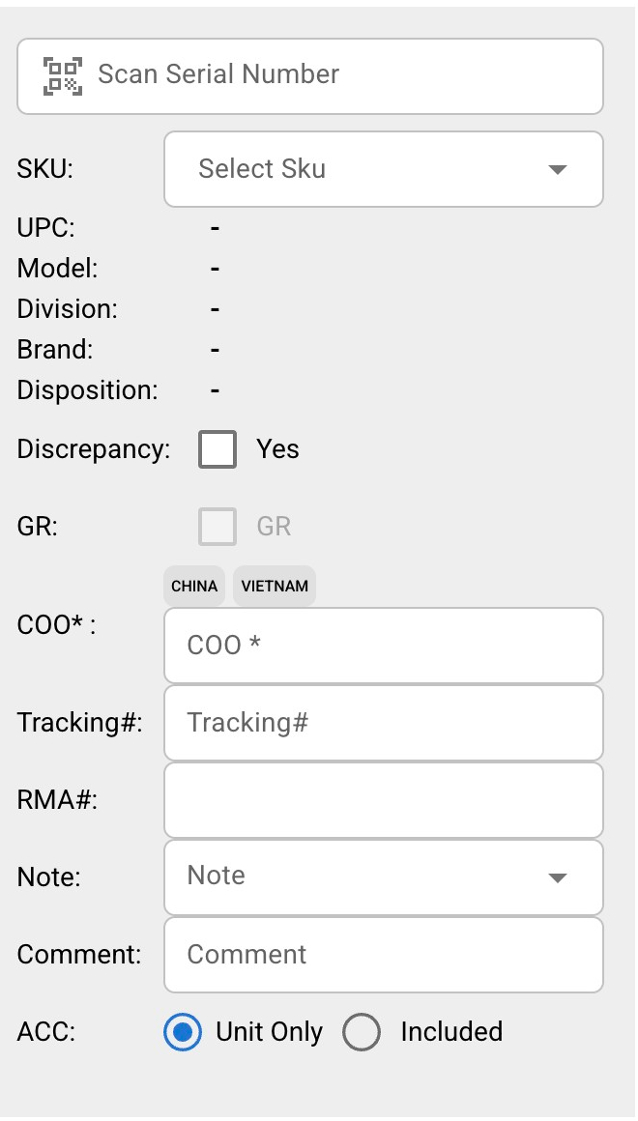 - Users can indicate whether the scanned item includes additional accessories (ACC) or if it is a unit-only entry.