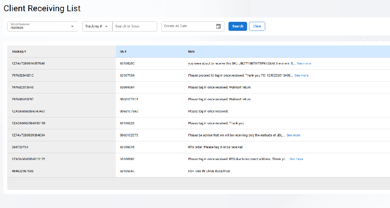 Client Receiving List Page allows you to search for a case by customer, Tracking #, RA #, or Create Date