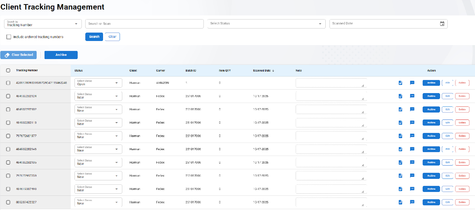 Client Tracking Management is a feature that allows the user to connect with a client and maintain status of tracking numbers that have discrepancy or issues in Receiving.