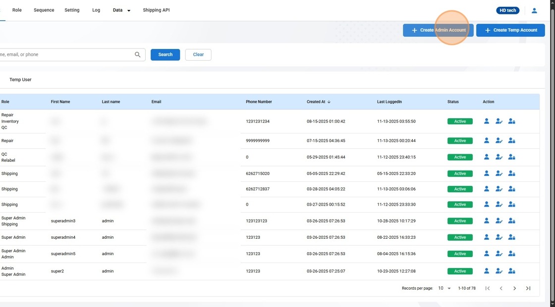 Role: Shows the role or multiple roles assigned to the user (e.g., Super Admin, QC, Shipping).